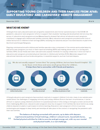 This brief is based on findings from a survey of 1,172 parents and guardians of five- to seven-year-old children across Massachusetts. For additional information, see the full report: How are they faring? Impacts of the COVID-19 pandemic on the lives of families and young children in Massachusetts. Supporting Young Children and Their Families from Afar: Early Educators’ and Caregivers’ Remote Engagement